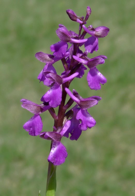 3608 Orchis palustris Jacq. - Voisin du précédent. Plante vivace de 30-60 cm, plus grêle, plus élancée, à feuilles dressées étroitement lancéolées-linéaires aiguës - fleurs d'un pourpre moins foncé, en épi lâche - bractées dépassant l'ovaire - labelle arrondi, marqué de nombreux petites points à la base, à 3 lobes peu profonds, le moyen échancré, aussi long ou souvent plus long que les latéraux d'abord étalés Disposé plus ou moins perpendiculairement par rapport à la tige . Tige étalée = tige couchée . puis réfléchis - éperon horizontal ou dirigé en bas, cylindracé-conique, atténué-obtus au sommet, d'un tiers plus court que l'ovaire. Écologie Marais et prés humides, surtout calcaires ou salés, dans une grande partie de la France. Répartition Europe ; Asie occidentale ; Afrique septentrionale. Floraison Juin-juillet. |